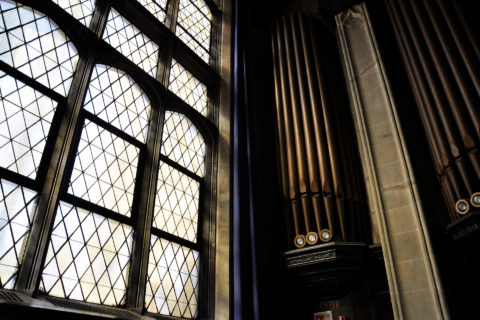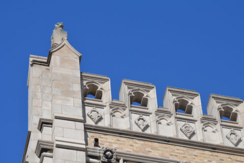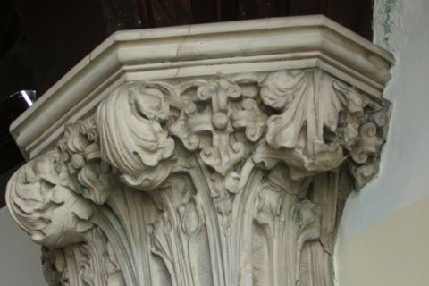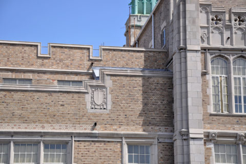 The auditorium is over 10,000 square feet, with a balcony, and is rendered in Collegiate Gothic style, with ornate plaster columns and architectural detailing. Of note are the molded plaster figures (grotesques) at the spring points of each of the plaster arches that span the aisles. Severe deterioration of much of the detailed plaster and the resultant safety hazard required emergency stabilization work, which we designed and administered.