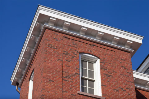 At the main building, the existing face brick could not be removed due to the load-bearing requirements of the sloped roof above. Our team created a new approach to address these design issues. Instead, we overclad the main building with new brick and adjoining details such as eaves, windows, and doors were relocated or modified to accommodate the change. Additionally, the wooden cornice was replaced with a simulated masonry cornice and custom copper gutter to match the historic profile.