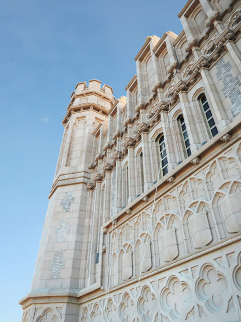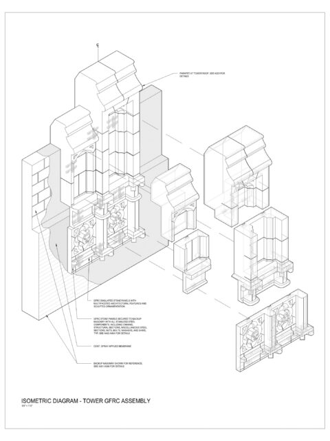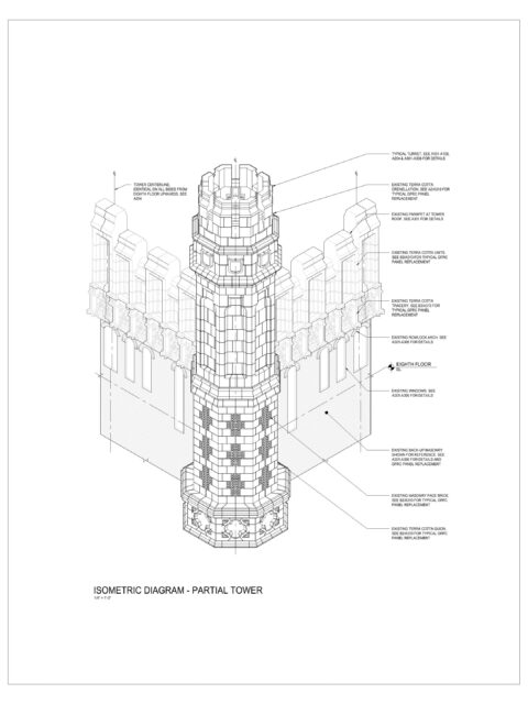 All the new and old terracotta pieces were removed and replaced with Glass Fiber Reinforced Concrete (GFRC) replicas, mimicking the historic exterior appearance. The entire tower was re-cladded with GFRC panels replicating brick masonry, allowing for a much lighting construction, all gables were rebuilt, selective brick masonry was repaired, selective limestone pieces were repaired or replaced, all roofs were replaced, and all foundations were injected with chemical resin to waterproof the perimeter.