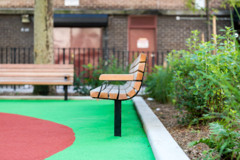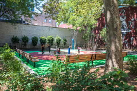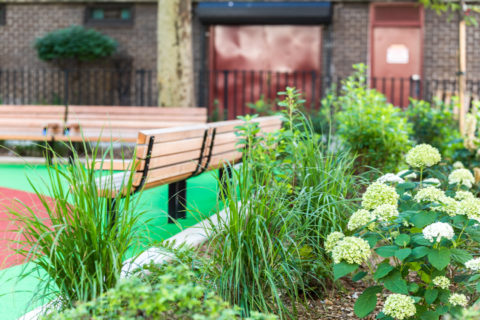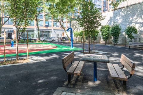 Nelligan White proposed and undertook an expanded redesign of the outdoor space. The sprinkler area, having been aged painted asphalt, is now a beautiful multicolor safety non-slip surface with new water fixtures. Our team designed a new seating area located at the corner of the playground that gives guardians an inviting and comfortable place to sit and watch their children. We installed a completely new seating area accompanied by barbeques in the north section of the space to make the playground ideal for small gatherings and events. We also rerouted circulation pathways to further separate the service access to the rear of the building and the play area and added gates to close the playground at night. Lastly, enlarged and improved garden areas with low maintenance planting provide a buffer from the street and create a compelling, green room.
