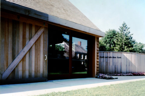 Visitors enter the site along a cedar wall that passes through the interpretive space and leads to a point directly opposite the front door of the original house. Exhibits on the wall form a reverse timeline, beginning with the mature Whitman who is most familiar and leading back through his formative years toward his birth point. Once the visitor has entered the site, the building and wall screen the cars, neon signs, and malls that press in on the site from all sides. The house can be experienced in a setting of trees, grass, cedar shingles, and siding. This administrative and interpretive center established the site of Walt Whitman’s Birthplace.